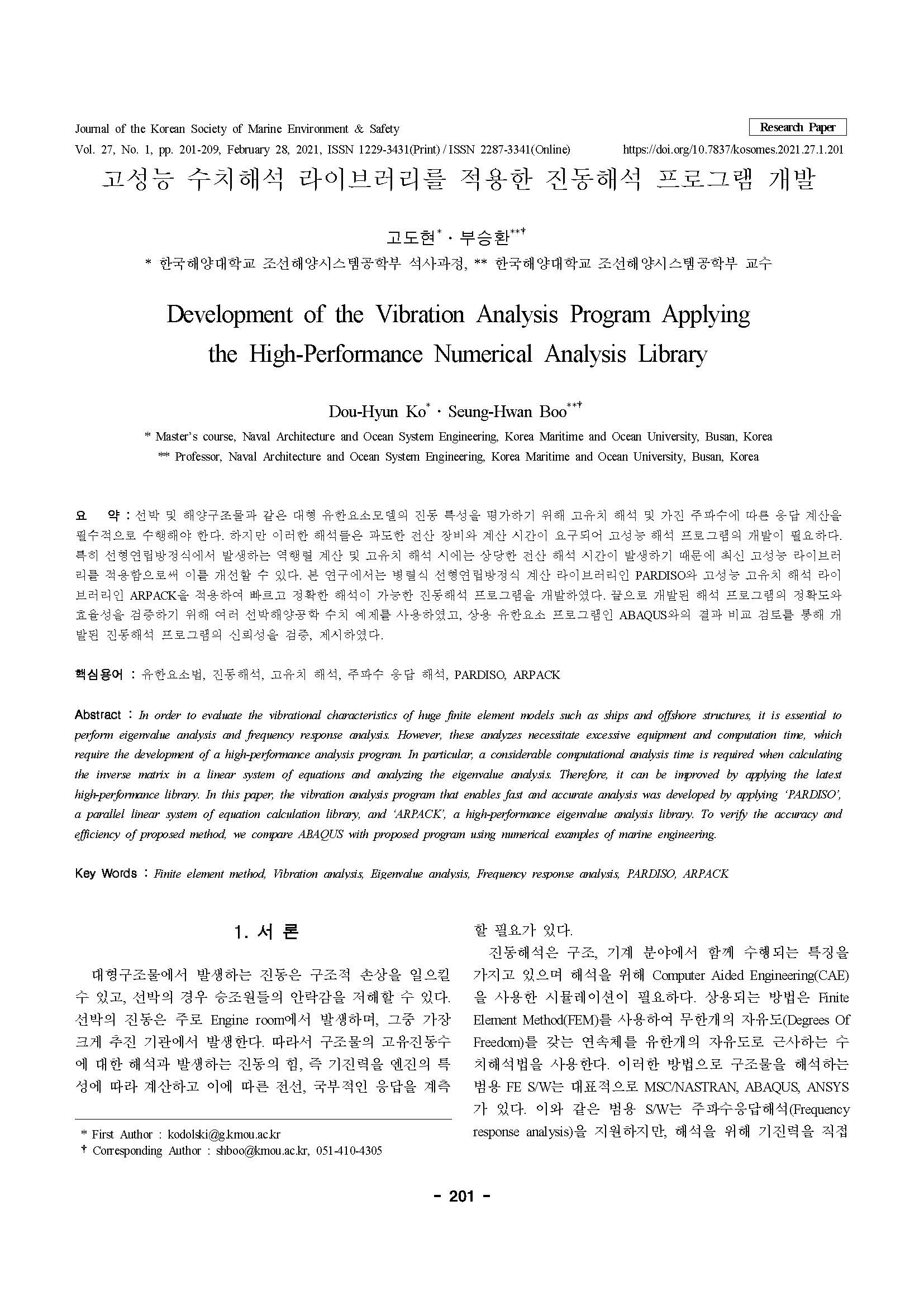 [KCI] Development of the Vibration Analysis Program Applying the High-Performance Numerical Analysis Library, Journal of the Korean Society of Marine Environment & Safety, Vol.27, p.201-209, 2021.