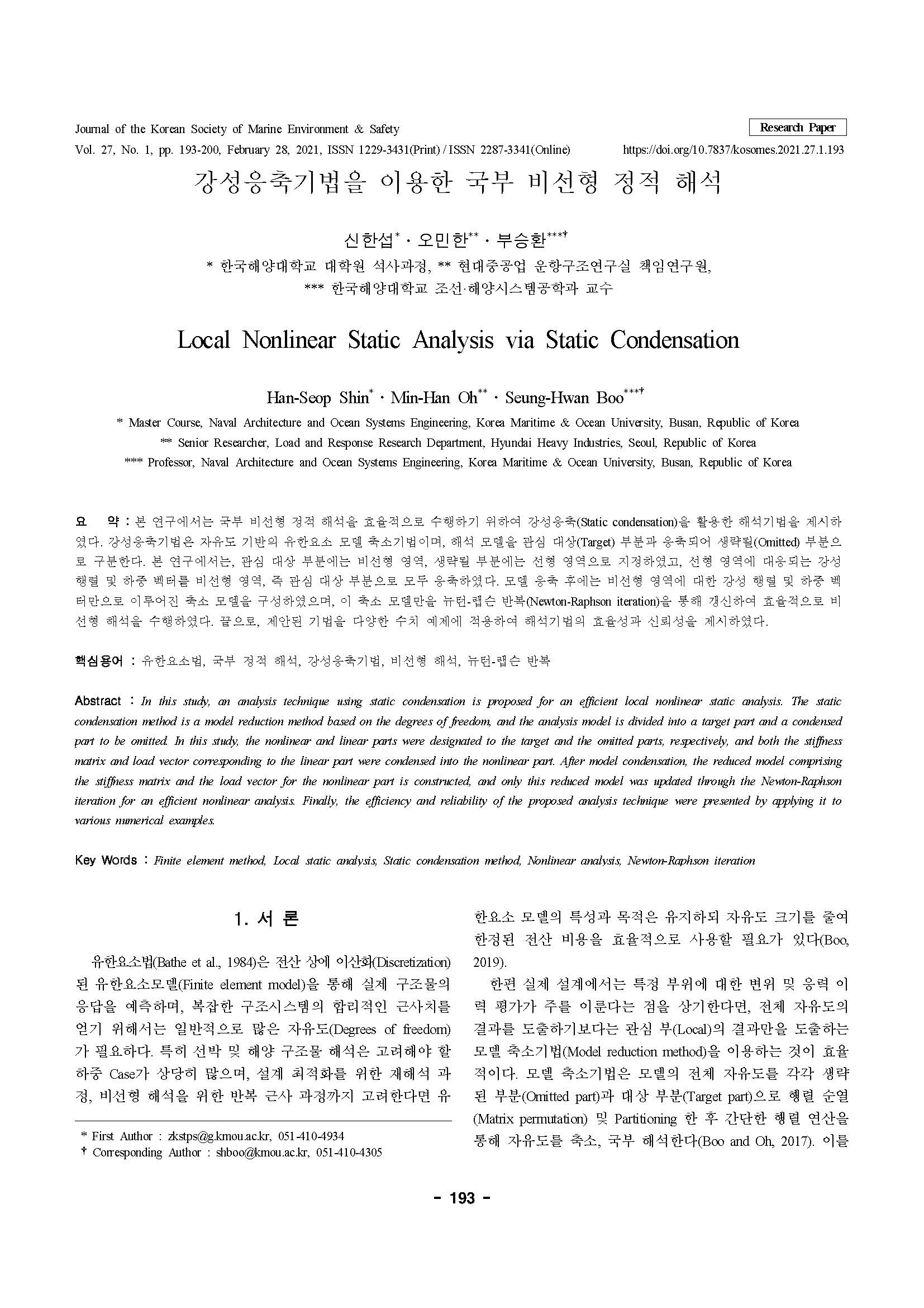 Journal of the Korean Society of Marine Environment & Safety, Vol.27, p.193-200, 2021.