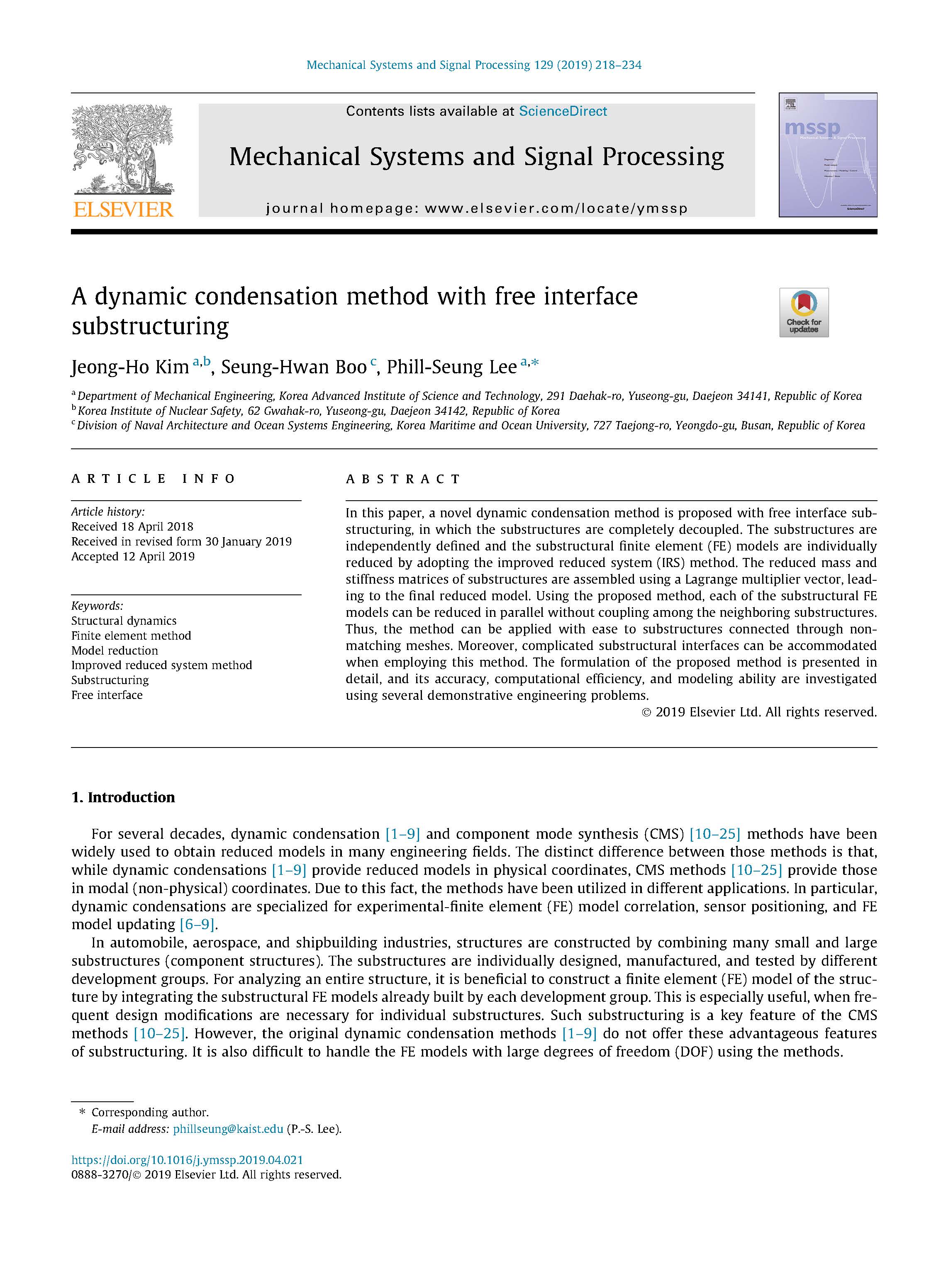 (Q1, IF:8.4) Jung-Ho Kim, Seung-Hwan Boo, Phill-Seung Lee. A dynamic condensation method with free interface substructuring,