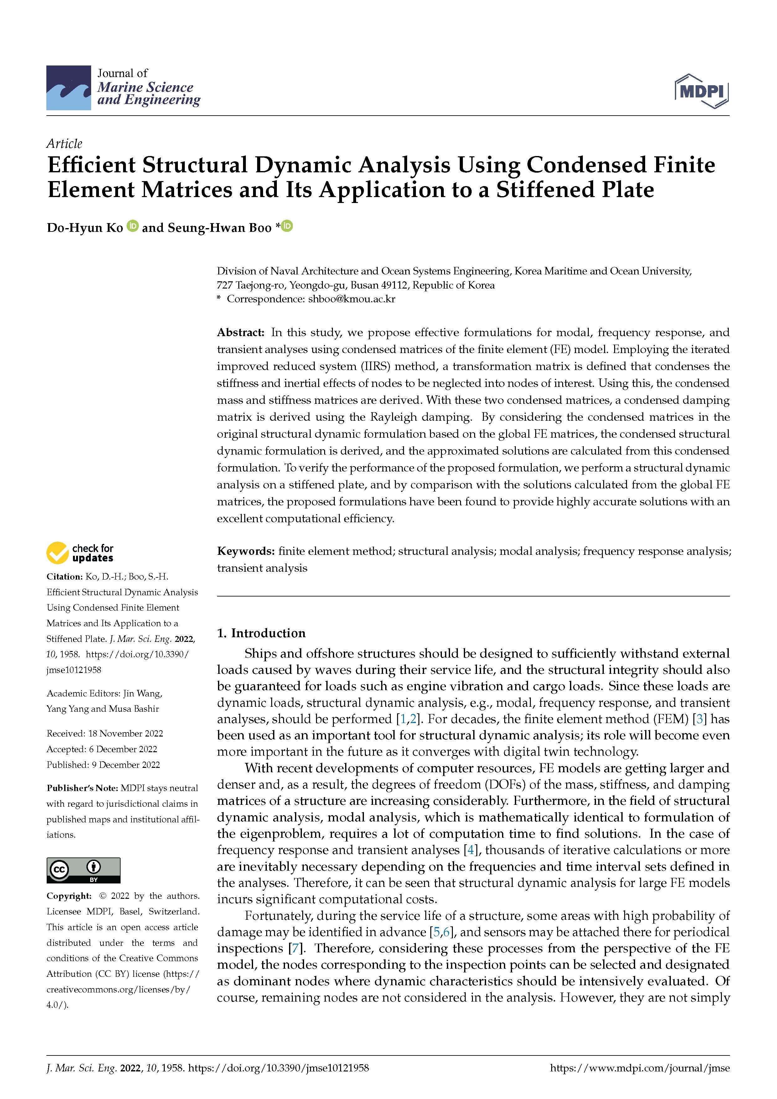 [SCI] (Q1, IF:2.9) Efficient structural dynamic analysis using condensed finite element matrices and its application to a stiffened plate, Journal of Marine Science and Engineering, 10(12), 2022.